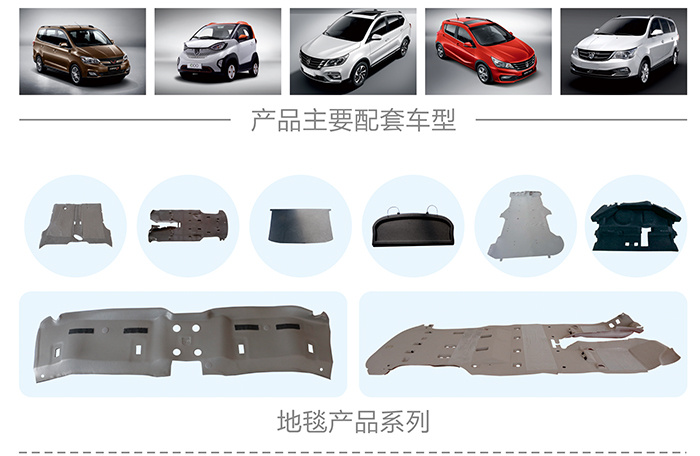 公司產(chǎn)品配套項(xiàng)目涵蓋轎車(chē)、MPV、SUV、新能源電動(dòng)車(chē)領(lǐng)域。公司主要參評(píng)有汽車(chē)頂棚、隔音墊、地毯、大型注塑件、橡膠制品、EPP泡沫等車(chē)內(nèi)飾品件。